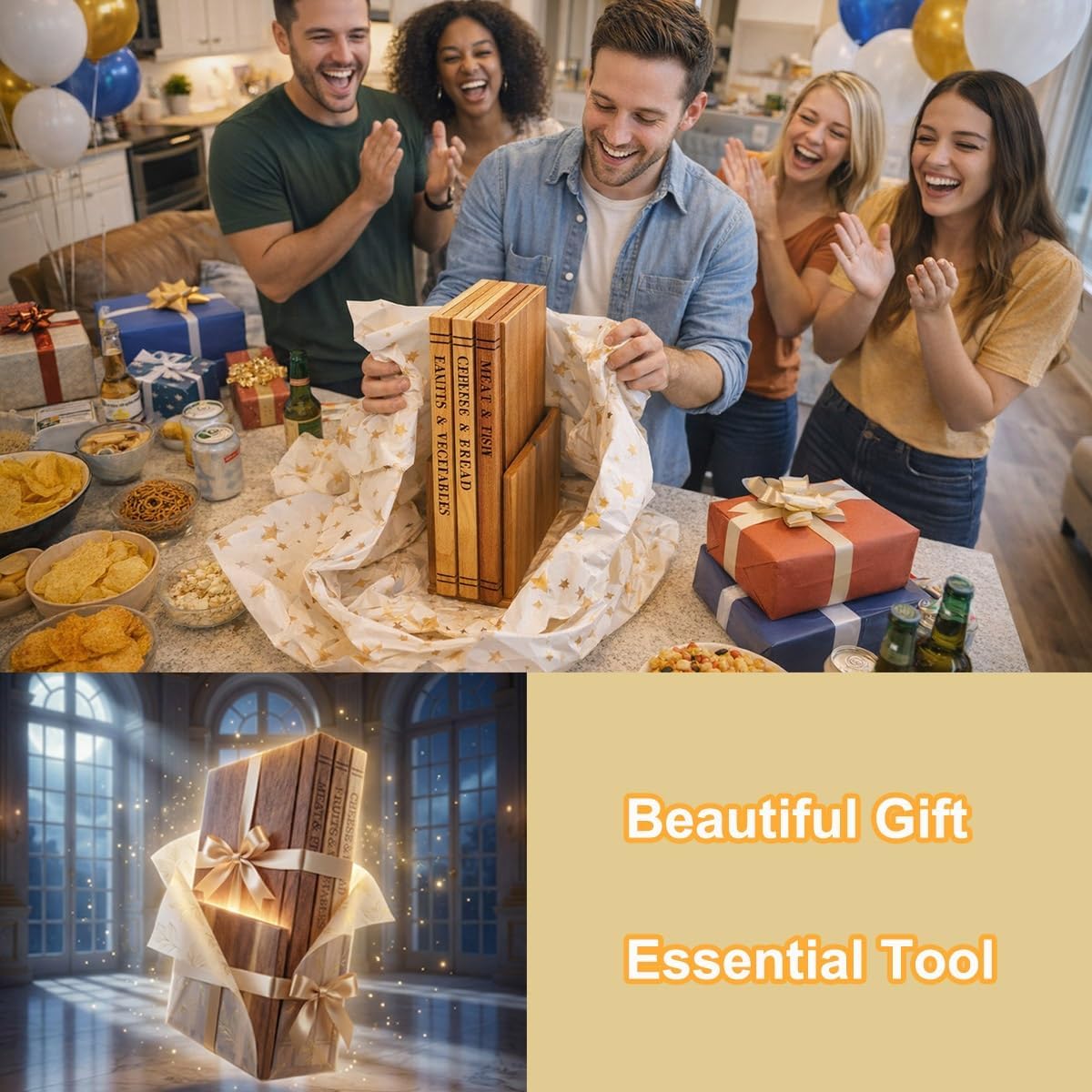 Book-shaped Wood Cutting Boards Non ToxicThis cutting board set brings natural order to your kitchen with three full-sized solid wood boards—Sapele for meats, Acacia for produce, and Rubberwood for breads and cheeses. Stored vertically in a bookshelf-style stand, they save counter space while adding warmth to your home. Crafted from 100% natural wood with no plastics or chemical coatings, these cutting boards non toxic by nature are safe for daily use. The Rubberwood board doubles as an elegant charcuterie board for entertaining, making this set as versatile as it is beautiful. A thoughtful house warming gift for new homeowners or a meaningful upgrade for anyone who loves to cook.Product SpecificationsMaterials & CraftsmanshipMaterials: 100% natural solid wood (Sapele, Acacia, Rubberwood)Finish: Food-grade natural wood oil treatmentCraftsmanship: Fine sanded surface, rounded corners, single-sided juice grooveSingle board: 33×25.5×2 cm / 13×10×0.8 inchesStand: 20×8×15 cm / 8×3.15×6 inchesTotal set weight: approx. 3.7 kg / 8 lbsDesign FeaturesLabeling: Permanent etched labels (Meat/Produce/Cheese & Bread)Storage: Integrated solid wood vertical standDesign: Book-style, three-volume setCare & UsageBest for: Home kitchens, gourmet food prep, ingredient separationCleaning: Hand wash recommended with warm water and mild detergentMaintenance: Apply food-grade mineral oil monthlyStorage: Avoid prolonged soaking or direct sunlight; vertical storage recommendedPackagingContents: 3 cutting boards, 1 solid wood standPlease Note: As a natural material, each board has its own character. Variations in wood grain and color are not flaws, but proof of its authenticity—making your piece one of a kind