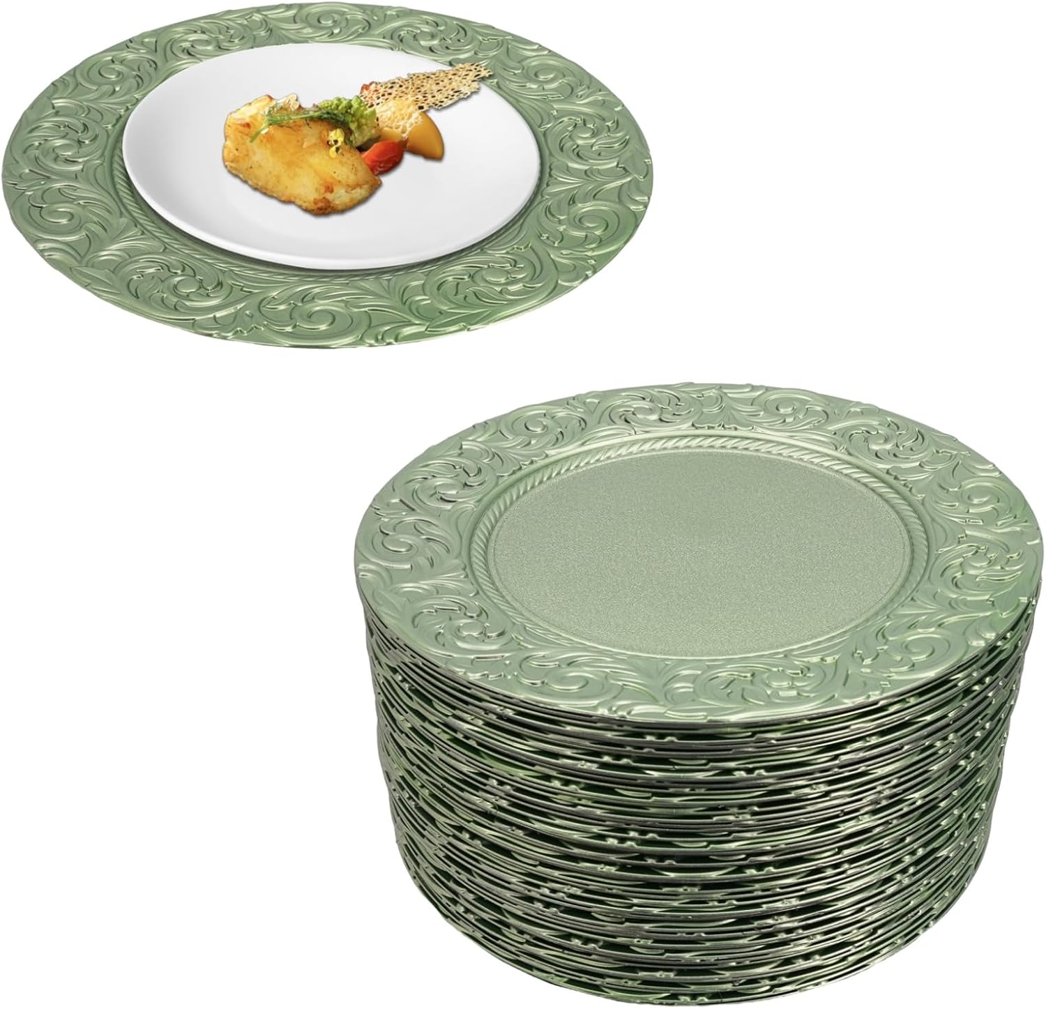 DescriptionThis set of plates can add elegant decorations to your banquet table for weddings, family gatherings, and holiday celebrations. The premium PP and the beautiful texture on the surface make each plate sturdy and durable and give it a beautiful and glossy appearance to be a great addition to your table.ApplicationThe charger plates are suitable for birthday parties, weddings, banquets, baby showers, family gatherings, restaurants, hotels, traveling, camping, picnics, BBQ, daily life, Halloween, Thanksgiving, Christmas celebrations, or other events.SpecificationsColor: BlackStyle: European Retro Shape: RoundMaterial: PPProcess: Spraying PaintAssembly Required: NoNumber of Pieces: 150Each Product Size(D*H): 33*2cm/12.99*0.79inPackaging Size: 71*35.3*36.3cm/27.95*13.9*14.29inGross Weight: 26.25kg/57.87lbsNet Weight: 24.94kg/54.98lbsPackage Included150* PlatesNotes Please check the style and size carefully before ordering.These plates are not suitable for microwave or dishwasher, please wash them in cold water and wipe them with a dry cloth, take care of them for long time use.It is not recommended that the product comes into direct contact with food.Please allow the slight color difference caused by the shooting light and 1-3cm error due to manual measurement, and make sure you do not mind before you order.