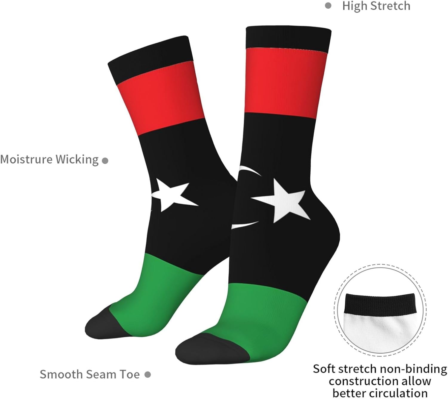 Libyan flag These socks are made from a blend of 95% polyester and 5% spandex, offering a skin-friendly and comfortable feel with excellent moisture-wicking, breathability, and pilling resistance to keep feet dry at all times. The spandex provides ample elasticity, ensuring zero pressure on the feet, while the stylish black toe adds a touch of trendy sock quality. The socks feature an all-over print design; avoid extremely fine fonts or patterns to ensure optimal print quality. Combining warmth and style, these socks are suitable for both everyday wear and sports, and come in sizes that cover most foot lengths (36-45cm). They are a versatile accessory that combines comfort, fashion, and practicality.