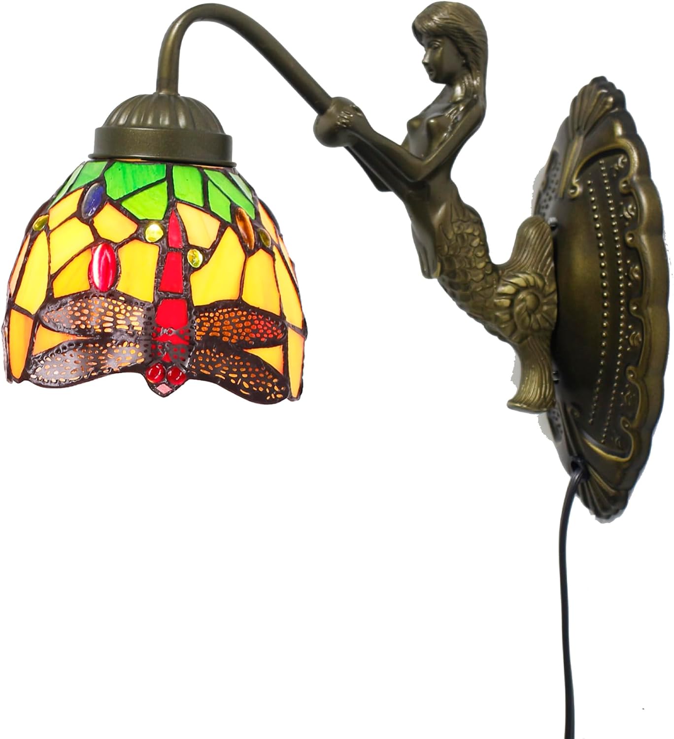 Tiffany Mermaid Wall Lamp Insert colored Glass Bedside lamp 6X12X11 inches, suitable for living room, bedroom and corridor (sea blue dragonfly style)