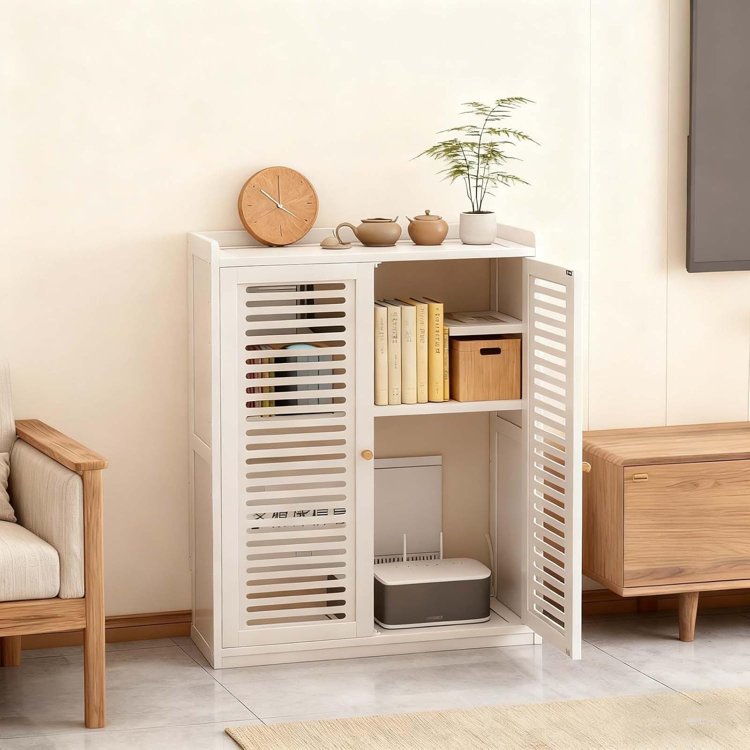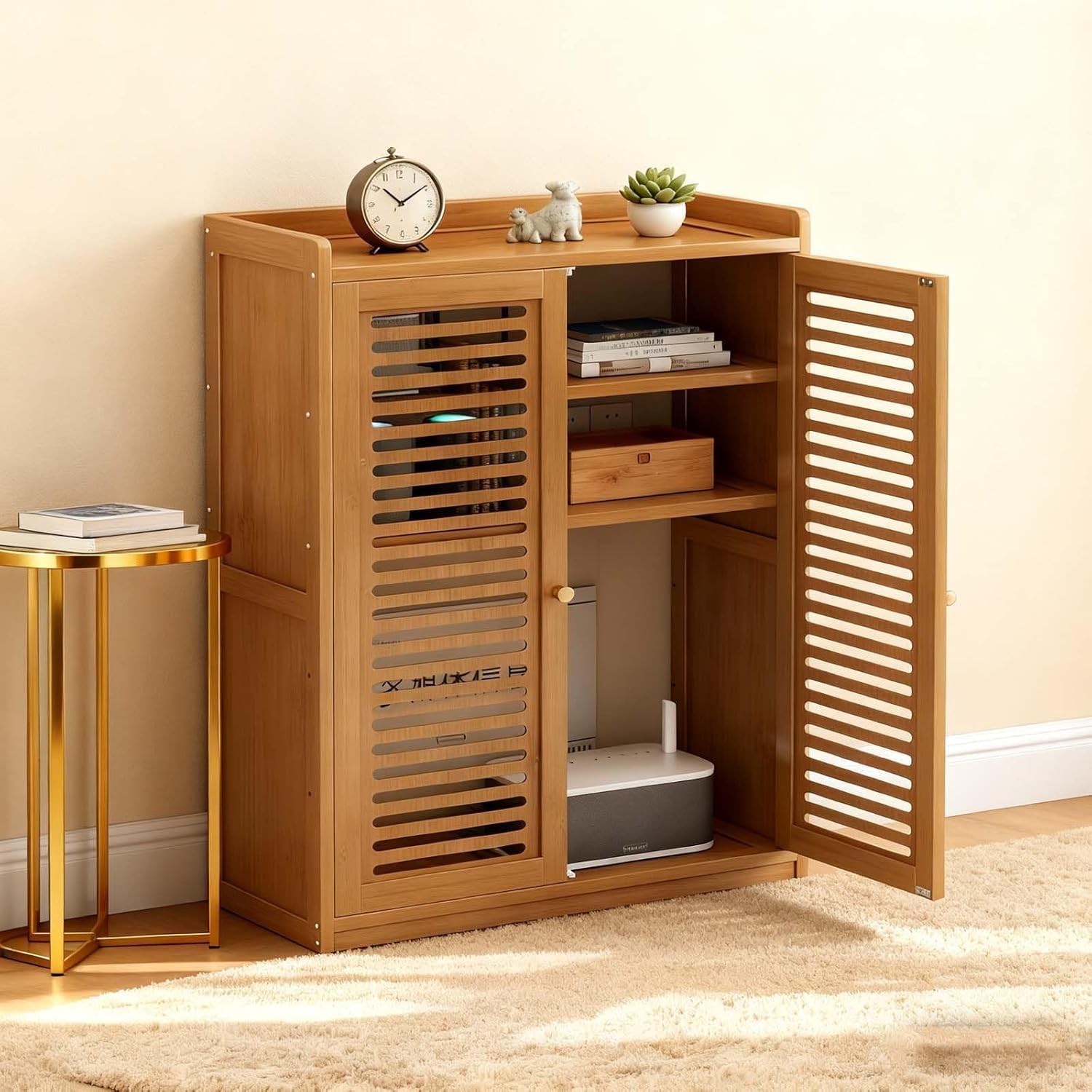 Our premium router box hider serves as an effective Wi-Fi cabinet, designed to neatly conceal routers, power strips, set-top boxes, and tangled cables, helping you achieve a clutter-free environment. Featuring adjustable shelves and signal-friendly ventilation, it accommodates devices of all sizes while maintaining robust connectivity and keeping equipment cool. Made from eco-friendly bamboo, this cabinet is moisture-proof and easy to maintain—simply wipe it down with a damp cloth for a spotless finish. It's the ideal solution for homeowners, remote workers, and small offices seeking to enhance their workspace. This stylish router storage box effortlessly complements modern and minimalist decor, making it a perfect addition to living rooms, studies, or hotels. With its blend of functionality and aesthetics, you can enjoy long-lasting tidiness and a streamlined look in any setting. Material: Bamboo, MDF Color Options: White, Black, Tea